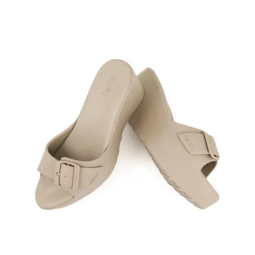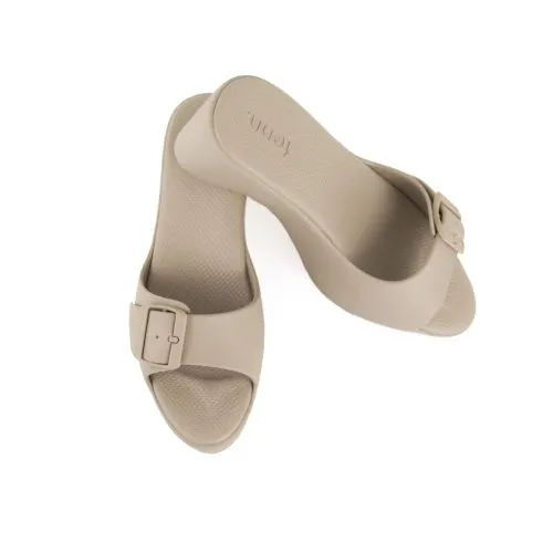 – A single strap with adjustable buckle – Non-slip outsoles – Breathable insoles – Two inches of extra height